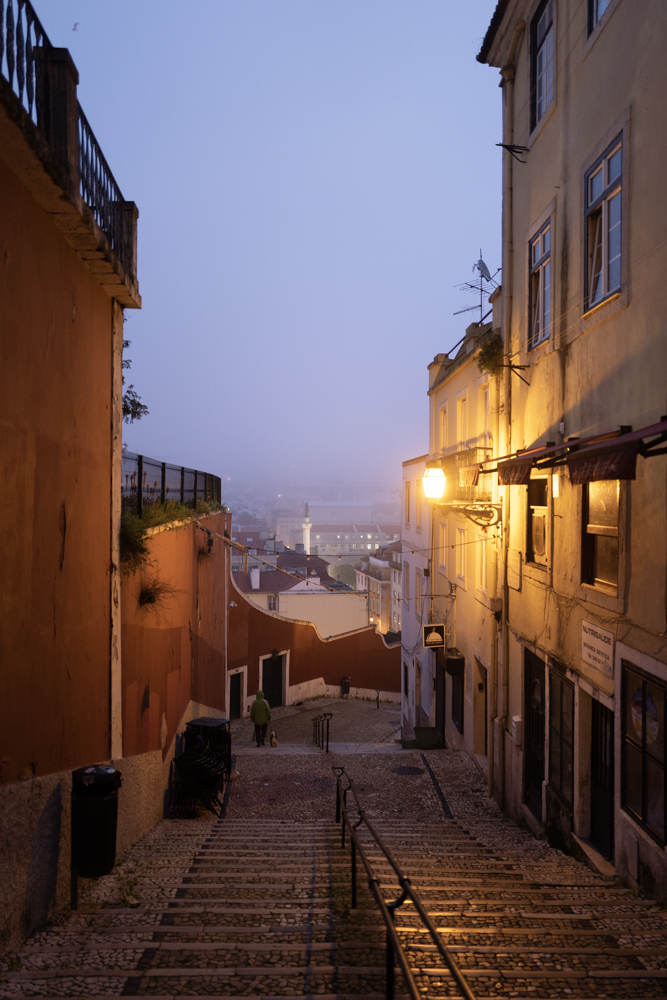 Looking down at Lisbon from the air, its streets are twisting and winding. The meandering paths are like capillaries, climbing rhythmically all over the city following the rise and fall of the terrain. The buildings on both sides of the roads are thin and tall. Although their textures and appearances vary widely, they are packed tightly at the joints without the slightest gap. The twisting roads force the buildings to arrange themselves in a snake-like formation. Due to the winding nature of the roads, nearby walls often obscure the scenery behind them. Buildings and walls play hide-and-seek, being amongst them constantly stimulates my nerves for exploration. But this is merely horizontal concealment—what pushes this thrill to the extreme is the vertical dimension.