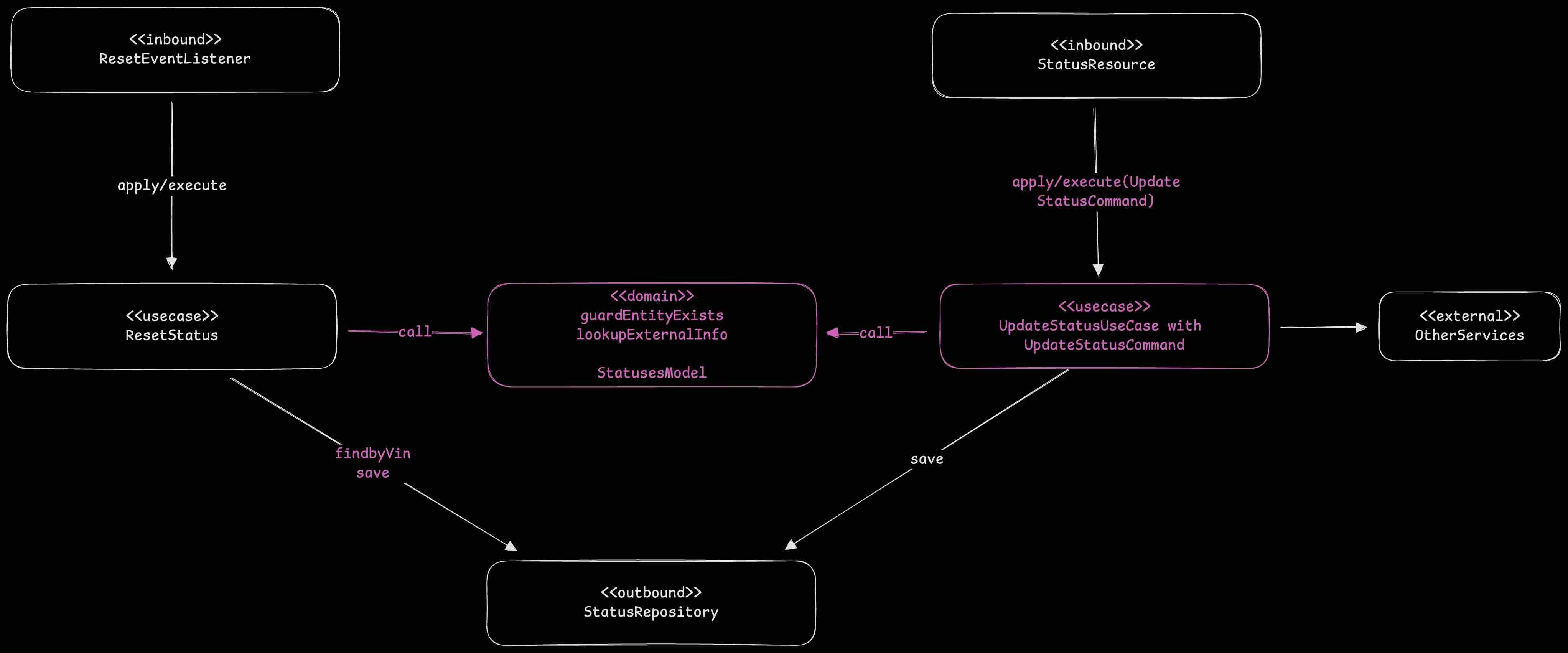 In the new structure, ResetStatus should interact directly with its required Outbound Port (StatusRepository) to save the reset status. It should not be coupled to another use case like StatusService.
