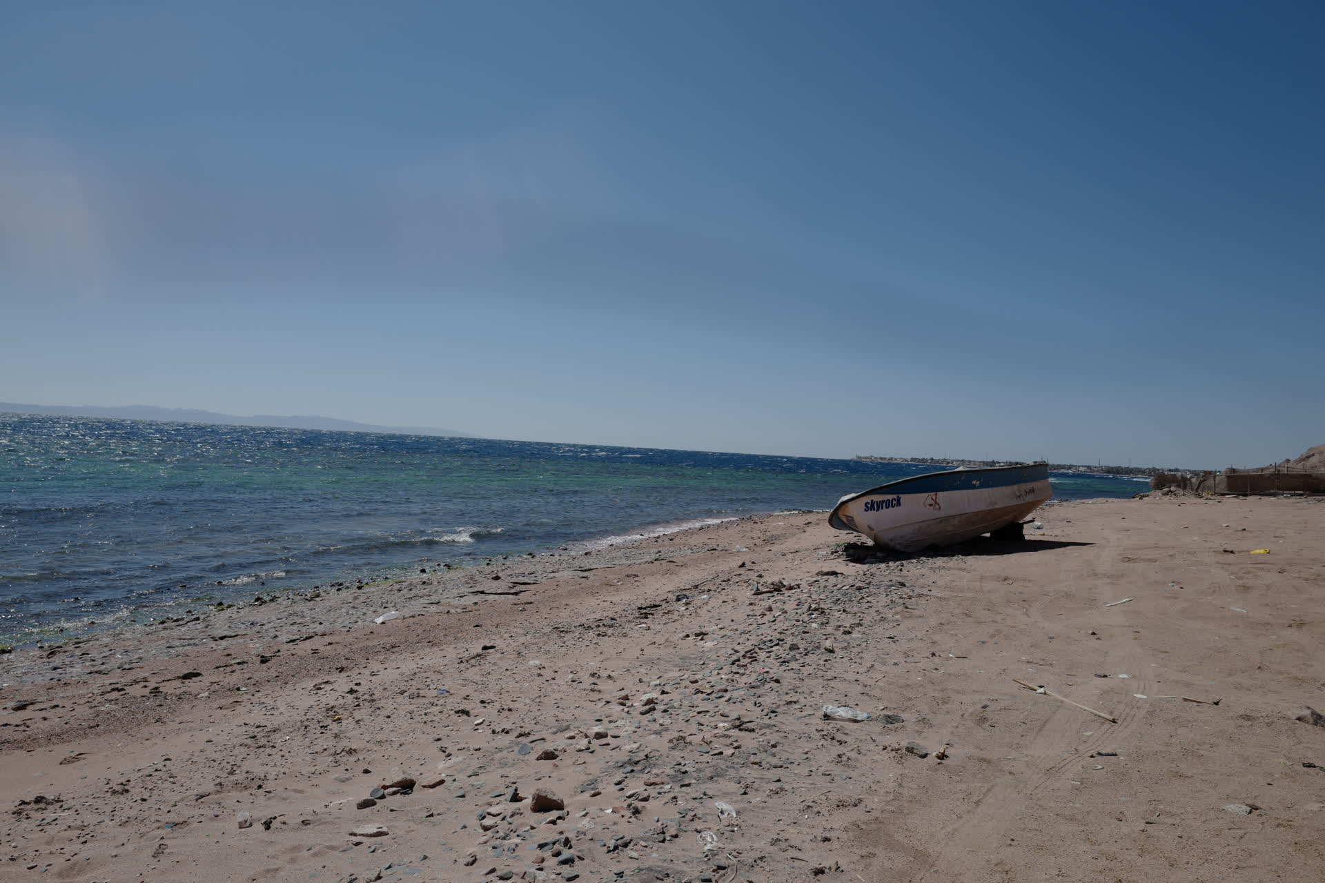 Stepping off the boat, our feet landed on a pebble beach. Carefully stacked stones nearby marked the docking spot. This was a vast coastal plain. North of Dahab, the mountains meet the sea, and any paths are only wide enough for hiking. Thus, Abu Galum, as the first plain we encountered, felt exceptionally precious. Looking around, all we could see were huts of various sizes—the only shelters available for human existence. The huts were backed by towering mountains and rocks, and though they faced the sea, the scene was far from idyllic.