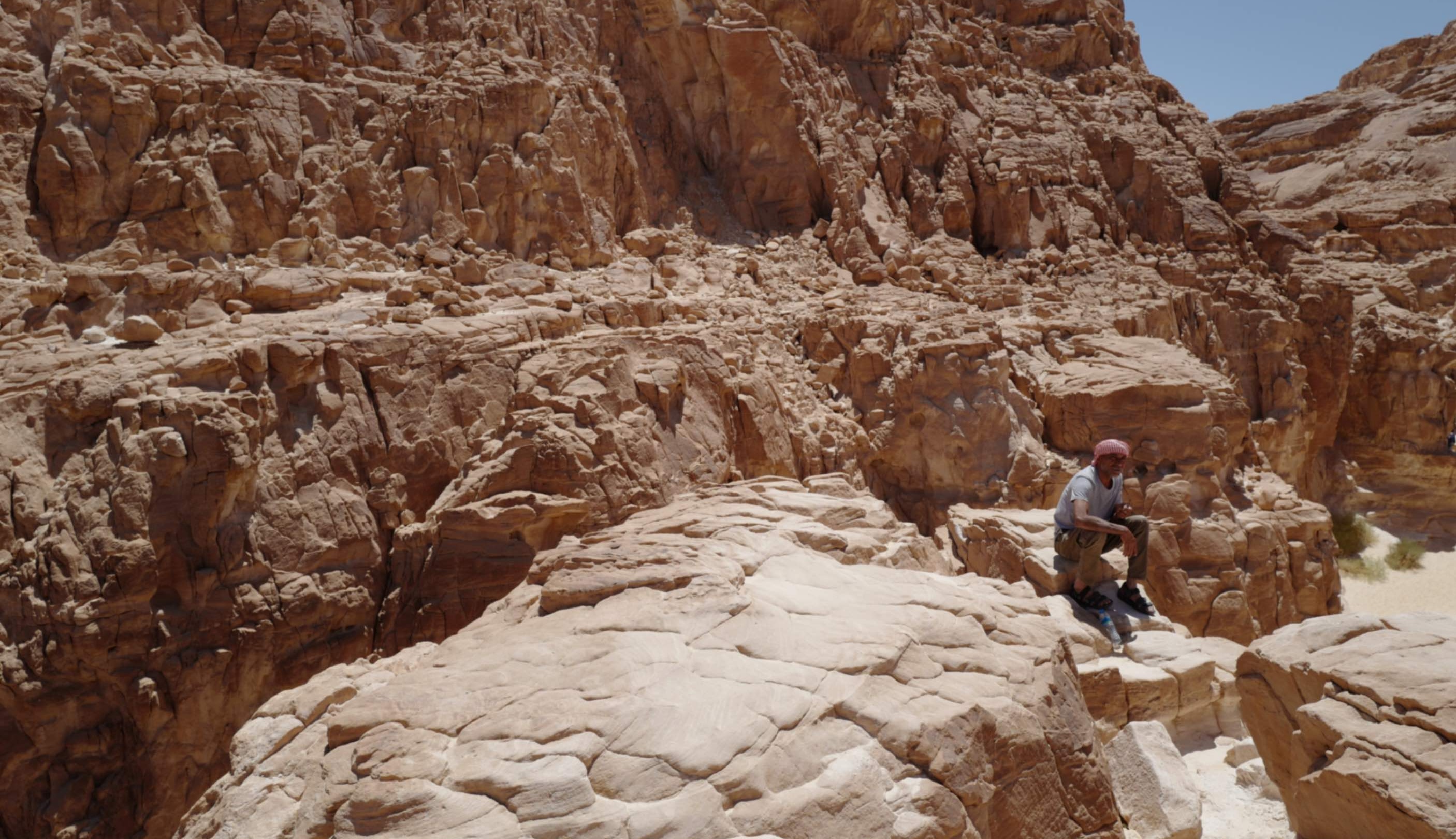 The canyon trail wasn’t always smooth. Sometimes we reached forks and had to wait for the guide’s instructions. The guide was a Bedouin man wearing a red headscarf, T-shirt, and cloth pants, with simple sandals. He carried no special gear, just a bottle of water. He was very responsible, moving back and forth to ensure no one was left behind or lost.