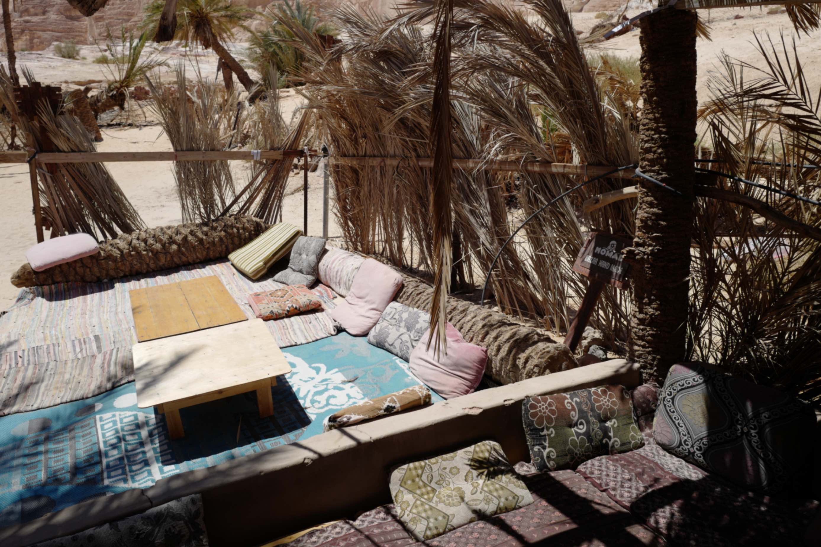 The canyon’s end was an oasis filled with signs of local life. The guide led us into a shelter to rest. The roof was made of palm leaves, and underneath were Arabic carpets and cushions. But after long use and many visitors, the carpets were gray, messy, and worn. Light filtered through the sparse palm leaves, swaying gently in the breeze, creating a dreamlike atmosphere. Next to the shelter was a fire pit, where another Bedouin squatted, brewing tea. He slowly lifted the kettle of boiling water and poured tea steadily into cups.