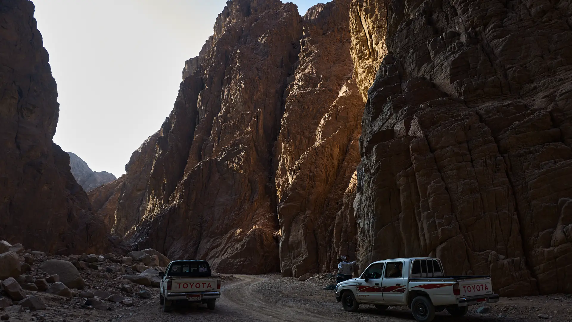 Less than half an hour by pickup truck takes you into the canyon. This is Bedouin territory where self-driving is virtually impossible, so having a local guide lead you into the mountains is almost the only choice. Perhaps it is because it is December, or simply that the mountains flanking the canyon are too high, but for most of the time, sunlight only graces the peaks and cannot penetrate to the foot of the mountains. The air is dry and crisp, and the temperature is exceptionally comfortable.