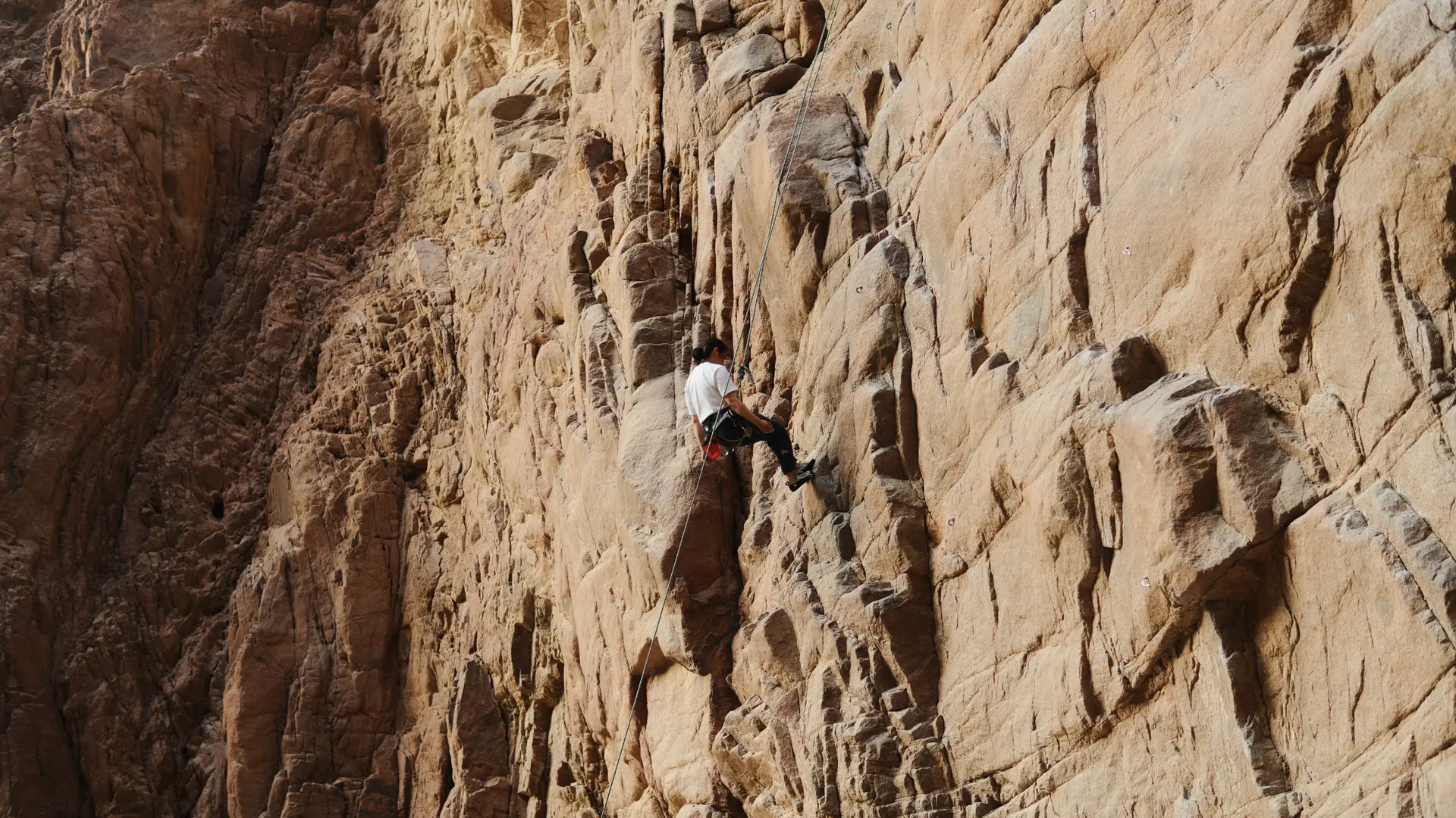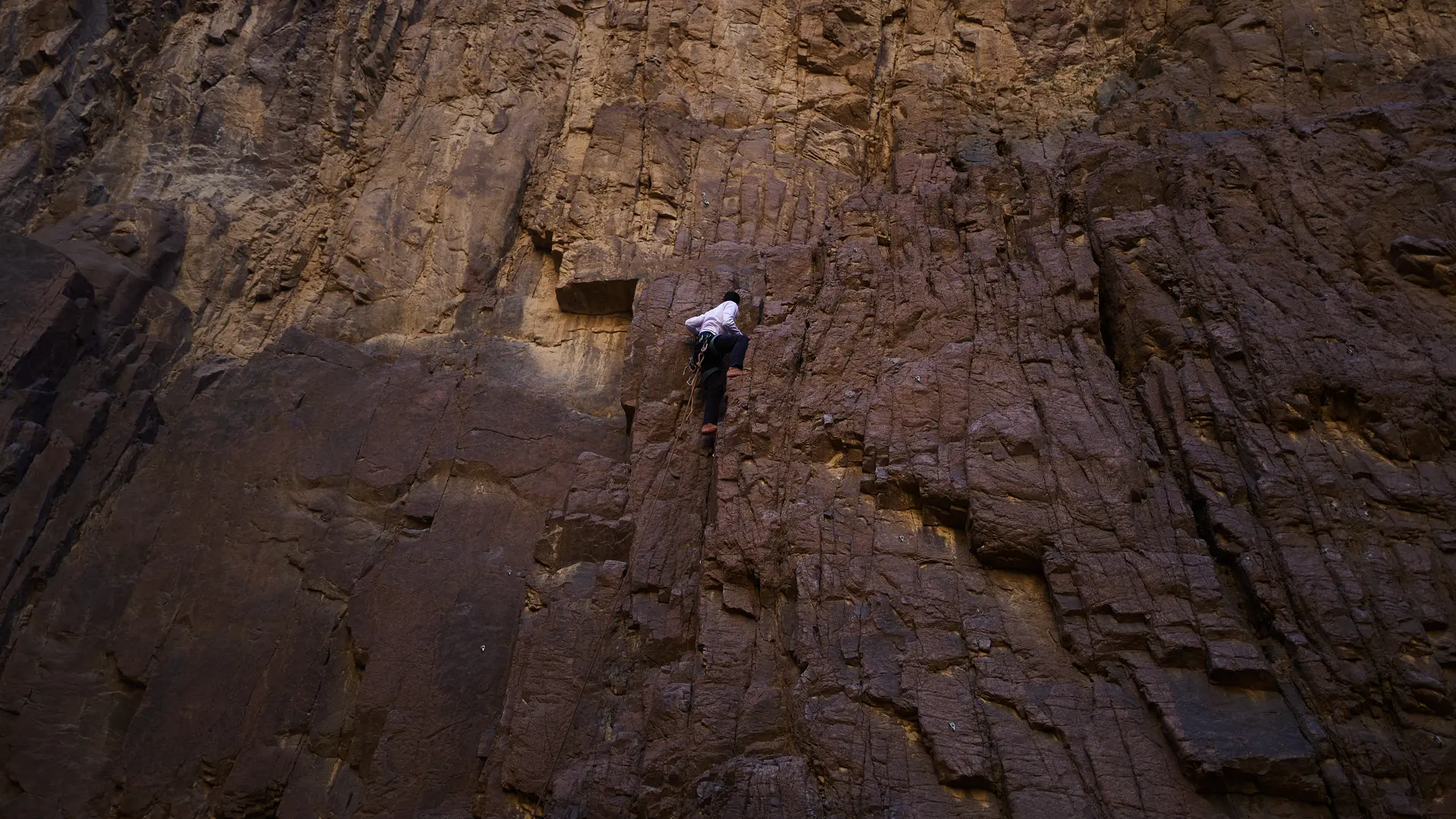 A more primitive form is known as Free Solo, which involves climbing upward relying solely on body contact with the rock wall without the use of any ropes or protective gear. Our local guide, Mohamed, sometimes chooses this method to reach the top and set up top-rope safety systems for beginners. Although he typically selects routes of lower difficulty, the mere act of climbing without any protection, and doing so barefoot, is enough to make one’s heart pound.