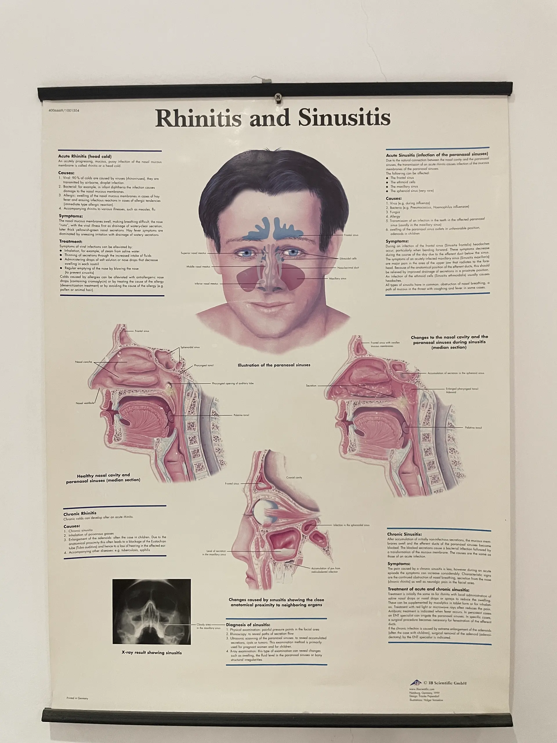 I thought the man was just an assistant but I was surprised when he started calling the name of the first patient. When the person answered, he crossed off the name and led them into the exam room. It turned out he was actually the doctor. I was second in line so I was called in quickly. The exam room was small and dim with only a single overhead light. There was a large anatomical chart of the ear, nose, and throat on the wall as well as models on the desk. He asked me to sit down and I explained my situation in English. He listened and nodded slowly before asking a few minor questions and using professional equipment to check my ears and nose. During the exam, he also asked me to try equalizing my ear pressure.